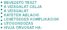 KATÉTER ABLÁCIÓHogyha a katéter abláció ajánlott, akkor a beteg és az orvos érdeke is amellet szól, hogy a diagnosztikus vizsgálattal együlésben történjen az ablációs beavatkozás. Az ablációval a szívnek a ritmuszavarért felelös szöveti része lesz egy magasfrekvenciájú hullámmal szétroncsolva. A kóros működésű szövet sikeres károsításával a szívritmuszavar azonnal megszünik. Újjabb ritmuszavar felleépte esetén a katéter abláció megismételhető. Az abláció 2-6 óráig eltarthat. A vizsgálat végével minden katéter eltávolításra kerül. A lágyék tájékára pedig egy nyomókötést helyeznek fel. 95%-a az ablációknak sikeres. A komplikációk lehetséges fellépte igen ritka. A súlyosabb komplikációkra példák: a szúrt ér bevérzése, vagy egy vérrög képződése, vagy a szívfal kilyukadása ill. állandó pacemaker beültetésének a szükségessége. A vérrög képződés megelőzése céljából minden beteg közvetlenül a vizsgálat megkezdésekor egy véralvadásgátló gyógyszert kap, amivel a komplikációk száma jelentősen csökkenthető. UTÓGONDOZÁSA vérnyomás, a szivfrekvencia, a légzés és a katéter szúrás helye a vizsgálatot követő 24 órában rendszeresen ellenörzésre kerül. Nem ritkán fordul elő a szúrás helyének megduzzadása, bekékülése a szövetek közé került vértől. A bevérzés elkerülése érdekében lehetőleg mozdulatlan lábbal ajánlott legalább 6 óráig az ágyban feküdni. Ha csak diagnosztikus vizsgálat történik, akkor a beteg a vizsgálatot követő napon hazamehet. Abláció esetén legalább 2-3 napig ajánlott a beteg szívfrekvenciájának és egyébb fontos funkcióknak az osztályon történő kontrolálása valamint a gyógyszerek beállítása.